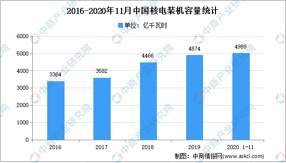 我國(guó)是世界上少數(shù)擁有比較完整核工業(yè)體系的國(guó)家之一,一直有序、積極的推進(jìn)核電的應(yīng)用。從核電裝機(jī)容量來看,近年來保持向好的趨勢(shì),2018年核電裝機(jī)量突破4000萬千瓦。數(shù)據(jù)顯示,2020年1-11月,我國(guó)核電裝機(jī)容量為4989萬千瓦,同比增長(zhǎng)2.4%;全國(guó)核電發(fā)電量3310億千瓦時(shí),同比增長(zhǎng)5%。