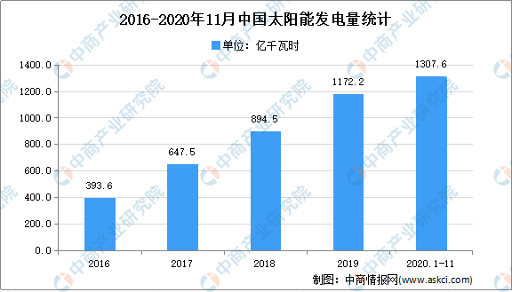 太陽能是一種可再生能源,指太陽的熱輻射能,主要表現(xiàn)就是常說的太陽光線,一般用作發(fā)電或者為熱水器提供能源。太陽能的利用有光熱轉(zhuǎn)換和光電轉(zhuǎn)換兩種方式,目前,太陽能光伏發(fā)電系統(tǒng)是主要的應(yīng)用。近年來,我國(guó)太陽能發(fā)電量持續(xù)提高。數(shù)據(jù)顯示,2019年我國(guó)太陽能發(fā)電量為1172.2億千瓦時(shí)。2020年1-11月我國(guó)太陽能發(fā)電量累計(jì)達(dá)1307.6億千瓦時(shí),同比增長(zhǎng)8.1%。