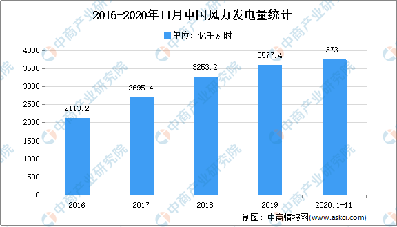 風(fēng)力發(fā)電是指把風(fēng)的動(dòng)能轉(zhuǎn)為電能,是一種清潔無公害的的可再生能源。數(shù)據(jù)顯示,2019年我國(guó)風(fēng)力發(fā)電量達(dá)3577.4億千瓦時(shí)。風(fēng)力發(fā)電持續(xù)增長(zhǎng),2020年1-11月風(fēng)力發(fā)電量為3731億千瓦時(shí),同比增長(zhǎng)10.7%。