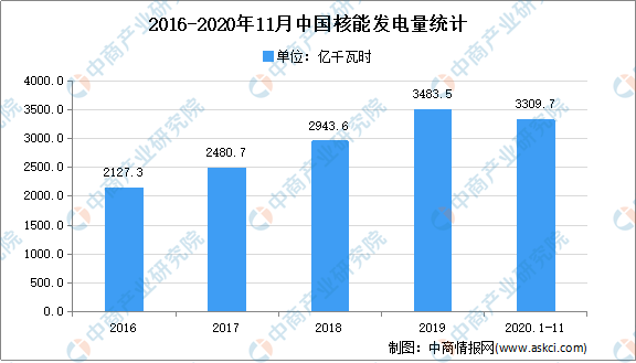 核能(或稱原子能)是通過轉(zhuǎn)化其質(zhì)量從原子核釋放的能量。核能是清潔能源,目前我國(guó)已建有秦山核電站、大亞灣核電站、嶺澳核電站等核電站,運(yùn)行情況良好。數(shù)據(jù)顯示,2019年我國(guó)核能發(fā)電量為3483.5億千瓦時(shí)。2020年1-11月全國(guó)核能發(fā)電量為3309.7億千瓦時(shí),同比增長(zhǎng)5%。