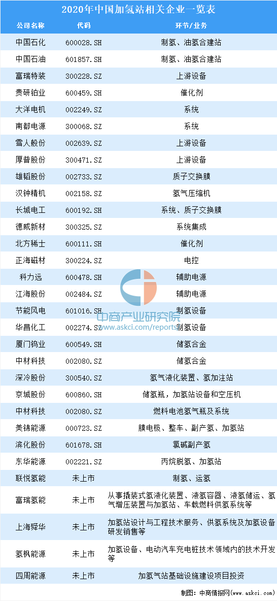 2020年中國(guó)加氫站相關(guān)企業(yè)一覽表