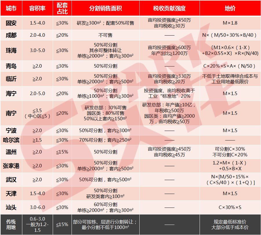 在配套用房占總建筑面積比例方面,大部分城市都差不多,基本都是不高于30%,這比傳統(tǒng)M1要求不高于15%已經(jīng)是成倍提升,顯示了針對(duì)新興產(chǎn)業(yè)及從業(yè)人群需求的滿足。這里面的四個(gè)特例是配套比例不高于20%的成都、海寧和南寧,以及不高于15%的溫州。