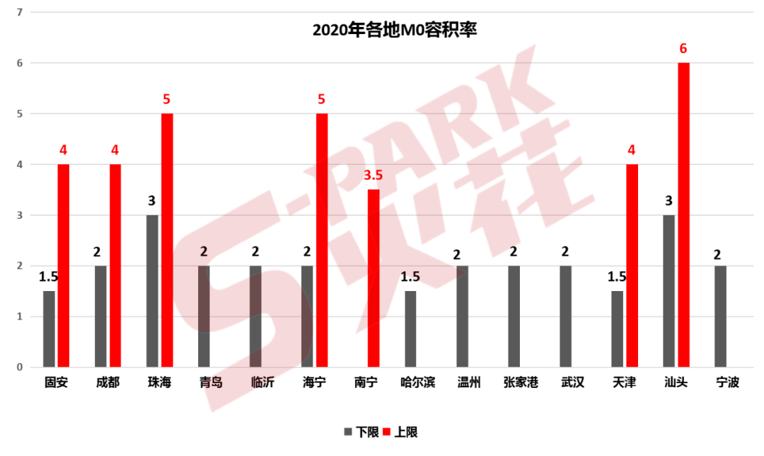 從容積率來看,大部分對(duì)M0容積率的要求都在2.0以上,這樣可以跟M1有一個(gè)很好的錯(cuò)位和承接。其中只有固安、天津和哈爾濱的下限設(shè)在1.5,位于粵港澳大灣區(qū)及強(qiáng)輻射區(qū)的珠海、汕頭下限設(shè)在3.0,汕頭的上限最高,為6.0,其次是珠海和海寧的5.0。
