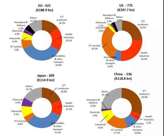 其他的主要產(chǎn)業(yè)還有化工,航空航天,冶金和設(shè)備制造業(yè),但是研發(fā)支出完全無法和上述的四個產(chǎn)業(yè)相比,最高的也就是494億歐元。