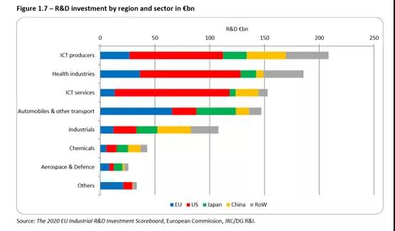 通過對歐盟發(fā)布的這個2020全球企業(yè)研發(fā)支出2500強的分析,其實結(jié)果是一樣的,可以看出ICT產(chǎn)業(yè)是全球研發(fā)投入最高,且在主要行業(yè)中研發(fā)支出增長最快,這也是為什么這兩年和美國的貿(mào)易戰(zhàn),科技戰(zhàn),高度集中在這個產(chǎn)業(yè)的原因,華為,中興,中芯國際,???,大華,商湯,科大訊飛等上了實體清單的企業(yè),都在ICT產(chǎn)業(yè)里面。