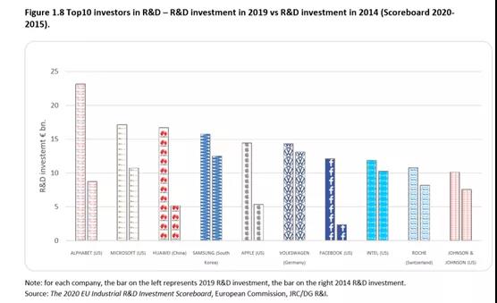 這些公司和2014年的研發(fā)投入對比,可以看出臉書,華為,蘋果,Alphabet,微軟等ICT公司增幅明顯更大,而大眾,羅氏,強生這樣的汽車和醫(yī)藥公司研發(fā)支出增幅相對較小。