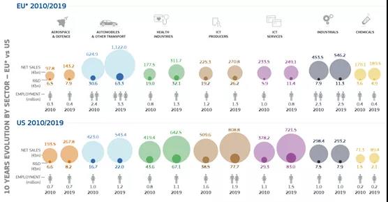 可以看出,歐洲2019年比2010年營收有明顯增幅的,主要是汽車行業(yè),醫(yī)療行業(yè)和航空航天產(chǎn)業(yè),其中歐洲的投資增量最大是在汽車產(chǎn)業(yè),醫(yī)療和航空航天也有較大增幅,但是基數(shù)較小,另外可以看出歐洲在ICT產(chǎn)業(yè)方面確實發(fā)展較慢,落后于中美。