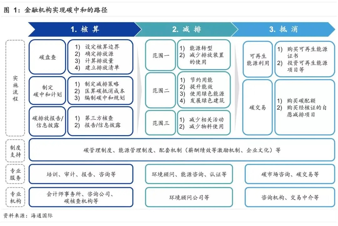 在碳中和規(guī)劃實施的過程中,金融機構(gòu)還需要在 ESG(環(huán)境、社會和公司治理)報告、 社會責(zé)任報告或企業(yè)年報中對經(jīng)第三方核證的碳排放信息進行披露,以便減排成果接受各利益相關(guān)方和公眾監(jiān)督。此外,金融機構(gòu)應(yīng)將減碳納入公司的戰(zhàn)略規(guī)劃和管治框 架,同時建立碳管理制度,配備專門團隊和專業(yè)人才負(fù)責(zé)推進碳信息核查與報告、碳數(shù)據(jù)管理、減排計劃執(zhí)行、內(nèi)外部溝通等工作。