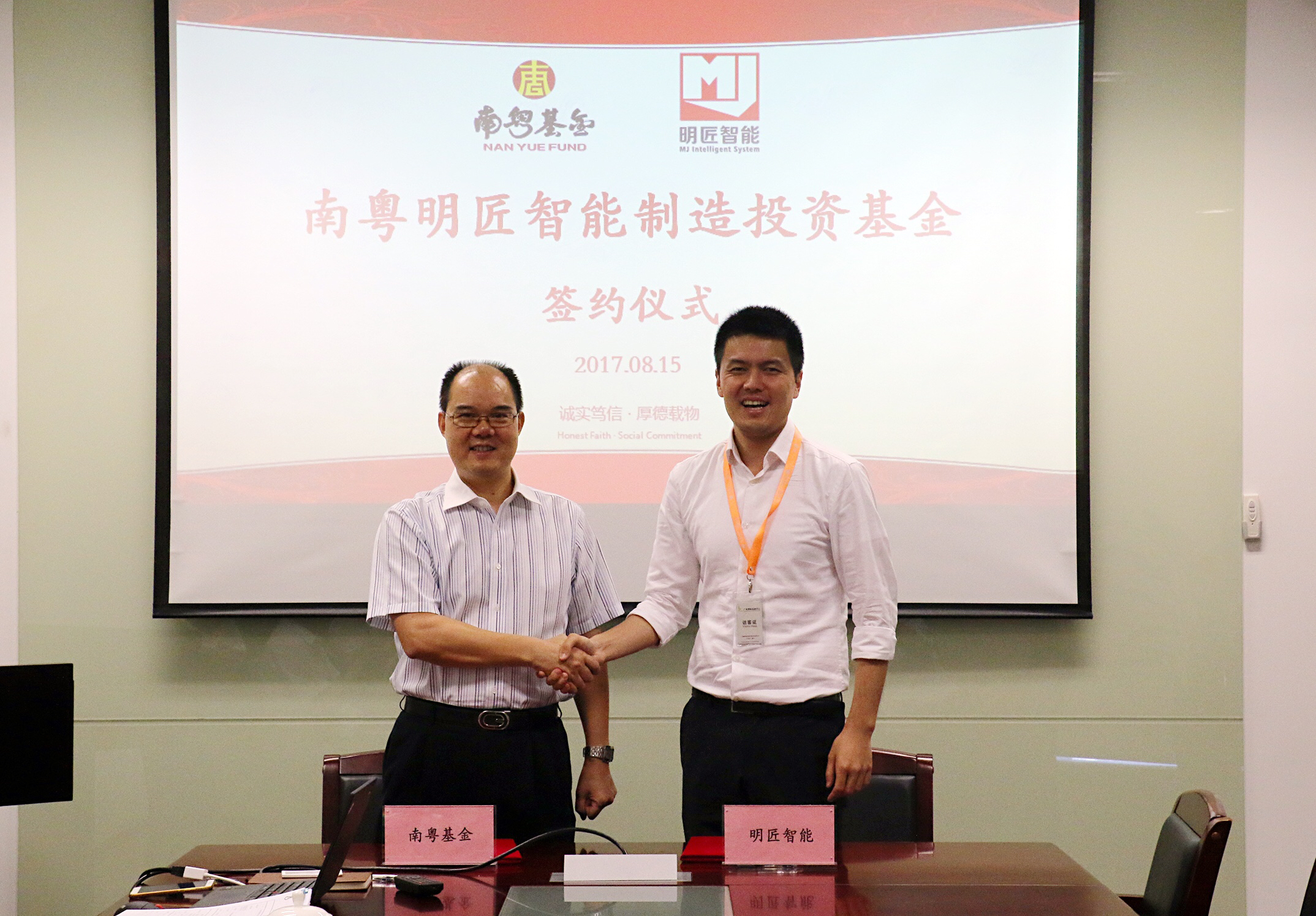 (左:南粵基金集團(tuán)總裁曾金賢 右:明匠智能公司董事長(zhǎng)陳俊)