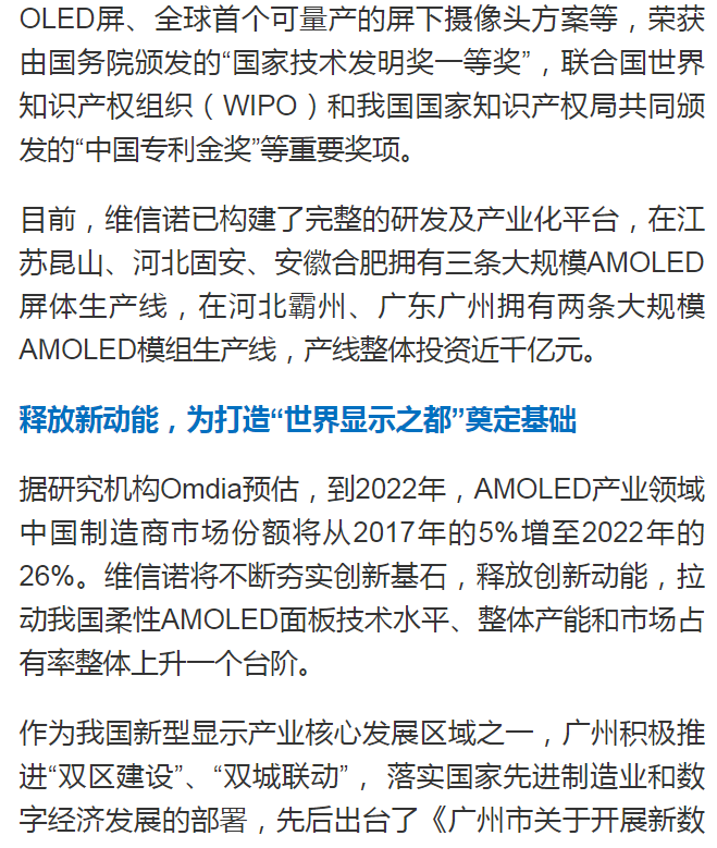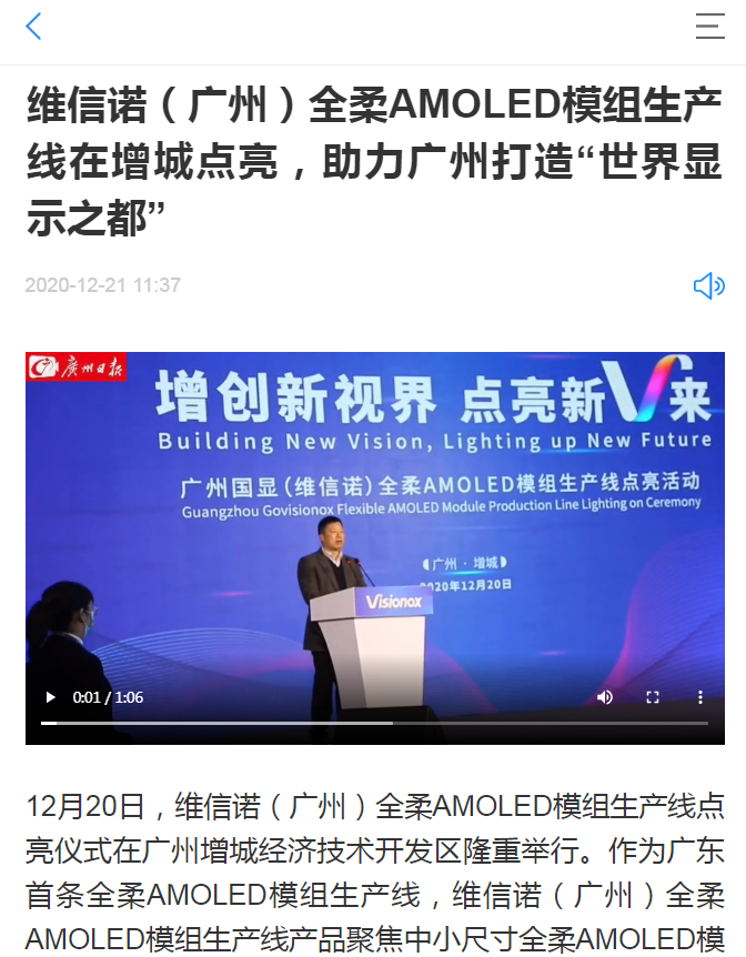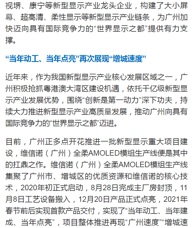 廣州日?qǐng)?bào)|維信諾(廣州)全柔AMOLED模組生產(chǎn)線在增城點(diǎn)亮,助力廣州打造“世界顯示之都”