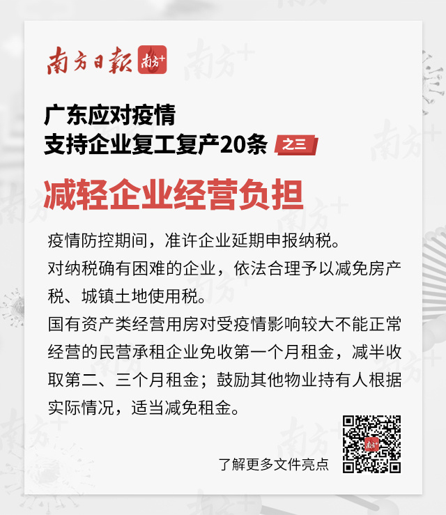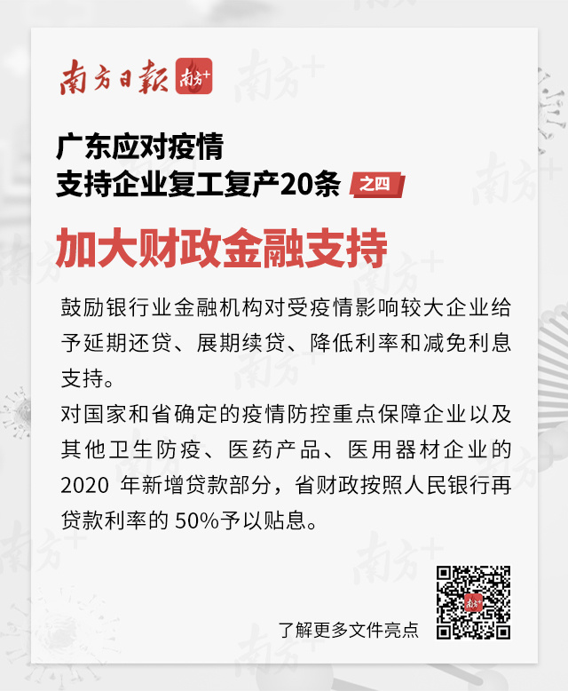 2月6日下午,廣東省政府正式印發(fā)《關(guān)于應(yīng)對新型冠狀病毒感染的肺炎疫情支持企業(yè)復(fù)工復(fù)產(chǎn)的若干政策措施》,從進(jìn)一步加大保障企業(yè)復(fù)工復(fù)產(chǎn)工作力度、降低企業(yè)用工成本、減輕企業(yè)經(jīng)營負(fù)擔(dān)、加大財(cái)政金融支持、優(yōu)化政府服務(wù)等關(guān)鍵環(huán)節(jié),提出了5方面共20項(xiàng)政策措施,全力支持和推動受疫情影響的各類企業(yè)復(fù)工復(fù)產(chǎn)。五圖輕松讀懂>>>