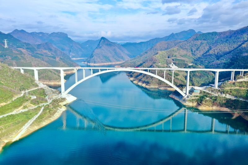 大橋建造首次將桅桿吊引入拱橋建設(shè)領(lǐng)域,創(chuàng)新性研發(fā)了庫(kù)區(qū)全周期拱肋空中翻身及吊運(yùn)下水技術(shù),突破庫(kù)區(qū)水位高差大對(duì)運(yùn)輸?shù)南拗?;首次研制主弦管外法蘭連接裝置;首次研發(fā)勁性骨架外包混凝土施工關(guān)鍵技術(shù)——“3環(huán)6段8工作面”同步澆筑施工工藝;進(jìn)一步升級(jí)纜索吊運(yùn)斜拉扣掛工藝;通過(guò)超大跨徑拱橋高精度線形控制方法,實(shí)現(xiàn)了600米主橋拱桁高精度合龍;高質(zhì)量完成C80管內(nèi)混凝土灌注。